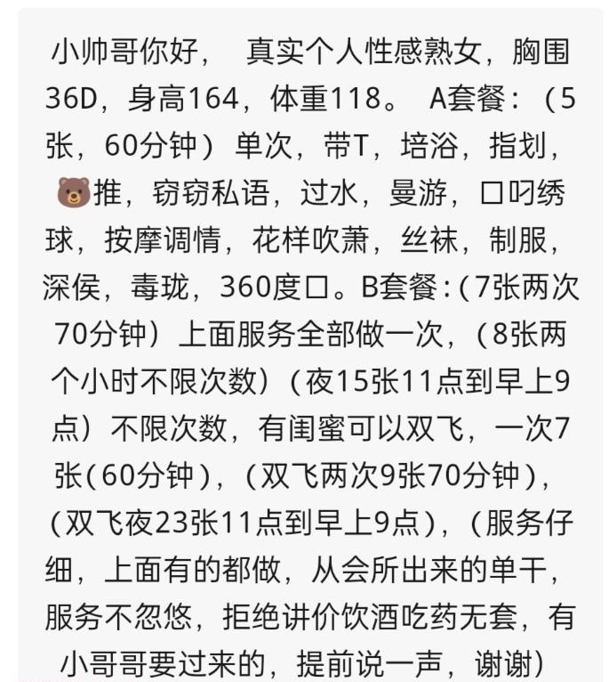 憋了蛮久没出鸡了,今天兴起问了身边朋友要到这少妇的联系方式,看了她的菜单和照片,菜单上的服务满齐全的 ...